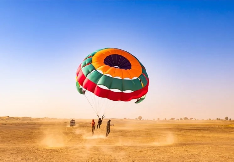 Parasailing in Jaisalmer is a good start for anyone who has a fear of flying. With the landing over the desert of Jaisalmer, there is much less possibility of an accident. Anyone above the age of 5 years is eligible to take up this sport.